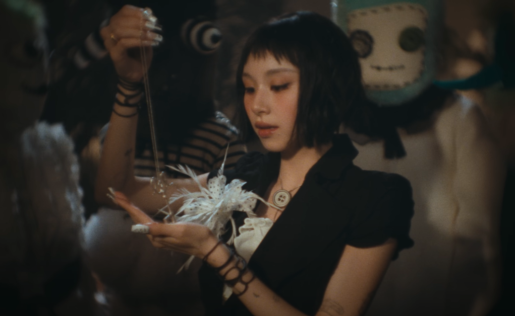 The music video for SHOOT (Firecracker) takes CHAEYOUNG into a storybook-like world with heavy Alice in Wonderland influences. From baking a cake outdoors to hosting a whimsical tea party with felt companions, the video leans heavily into pastel aesthetics and playful imagery.